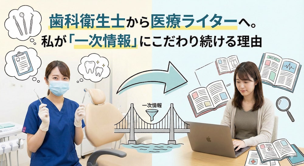 歯科衛生士から医療ライターへ。私が「一次情報」にこだわり続ける理由 三浦さやか, 2025年11月21日2025年11月27日 最終更新日 2025年11月27日 by 三浦さやか ネットに溢れる健康情報、どれを信じればいいんだろう?海外の最新論文が読めたら、もっと患者さんの役に立てるのに…。 最前線で働くあなただからこそ、そんな風に感じたことが一度はあるのではないでしょうか。 こんにちは。オーストラリア・メルボルンで医療ライターをしている三浦さやかです。 私はもともと日本で6年間、歯科衛生士として働いていました。現場にいた頃の私自身が、まさに冒頭のような悩みを抱えていた一人です。 この記事では、私がなぜ歯科衛生士から医療ライターへと転身し、そしてなぜこれほどまでに「一次情報」にこだわり続けるのか、その理由と具体的な方法を、私の経験を交えながらすべてお話しします。 この記事を読み終える頃には、あなたも情報の波に溺れることなく、プロとして本当に価値ある情報を掴み取り、患者さんと自分自身の未来を守るための武器を手に入れているはずです。 目次1 「その情報、本当ですか?」- 私が医療ライターになった原体験2 なぜ「一次情報」なのか?現役医療ライターが語る3つの本質的価値2.1 価値1:情報の”鮮度”と”正確性”を守るため2.2 価値2:患者さんの「なぜ?」に、プロとして答えるため2.3 価値3:「あなただけの視点」という最強の武器を手に入れるため3 英語が苦手でも大丈夫!メルボルン在住ライターの”一次情報”発掘術3.1 私の情報収集ツールボックスを全公開3.2 リサーチから記事になるまでの5ステップ4 一次情報を使いこなせば、日本の歯科医療の未来はこう変わる4.1 歯科衛生士・歯科医師にとってのメリット4.2 患者さんにとってのメリット4.3 日本の歯科業界全体への貢献5 まとめ 「その情報、本当ですか?」- 私が医療ライターになった原体験 「三浦さん、これネットで見たんだけど、オイルプリングって本当に歯が白くなるの?」 私が歯科衛生士だった頃、ユニットサイドで患者さんからこういった質問をされることは日常茶飯事でした。そのたびに、私は言葉に詰まってしまったのです。 もちろん、学校で習った知識や経験則で「科学的な根拠はまだ限定的ですよ」と答えることはできます。でも、患者さんが本当に知りたいのは、その先にある「なぜ?」の部分。その問いに、私は自信を持って答えることができませんでした。 情報の”伝言ゲーム”が引き起こす悲劇も目の当たりにしました。海外の小さな研究結果が、メディアやインフルエンサーによって増幅され、いつの間にか「〇〇をすれば絶対に虫歯にならない」といった、全く違うニュアンスで広まっていく。その情報を信じてセルフケアを怠ってしまった患者さんの口腔内を、私は今でも忘れることができません。 そんなモヤモヤを抱えていた私に、決定的な転機が訪れます。それは、人生の新しいステージを求めて移住した、ここオーストラリアでの出来事でした。 慣れない生活の中、歯の詰め物が取れてしまい、現地の歯科医院へ駆け込んだのです。そこで提示されたセラミック治療の費用は、日本の感覚では考えられないほどの高額でした。 なぜこんなに高いのか。保険制度の違いはあれど、もっと他の選択肢はないのか。 必死で論文や現地の歯科情報を調べ尽くした結果、私は日本ではあまり知られていない材料や治療法があること、そして何より「情報を知っているか否か」で、自分の健康と資産を守る選択肢が全く変わってしまう現実に愕然としたのです。 この時、私の心は決まりました。「正しい情報へのアクセス格差を、絶対になくしたい」と。 専門家であるはずの医療従事者でさえ、情報の洪水の中で迷子になっている。ましてや患者さんはもっと不安なはず。誰かが、情報の源流まで遡り、それを分かりやすく翻訳して、本当に必要としている人へ届ける役割を担わなくてはならない。 その想いが、私を歯科衛生士から医療ライターへと突き動かした原動力なのです。 なぜ「一次情報」なのか?現役医療ライターが語る3つの本質的価値 私がこだわる「一次情報」とは、研究者が自ら実験や調査を行って発表したオリジナルの論文や、政府が発表した統計データそのものを指します。 いわば、情報の”源泉”です。 誰かがまとめた解説記事(二次情報)は手軽ですが、私は必ずこの源泉まで遡ることにしています。それには、プロとして譲れない3つの本質的な価値があるからです。 価値1:情報の”鮮度”と”正確性”を守るため 医療の世界は、まさに日進月歩。昨日の常識が、今日の非常識になることも珍しくありません。 誰かが解説した記事を鵜呑みにする「孫引き」は、非常に危険です。元の論文の意図とは違う解釈がされていたり、情報が古くなっていたりする可能性があるからです。 医療の基本に、EBM(Evidence-Based Medicine:根拠に基づく医療)という考え方があります。これは、「最善の科
